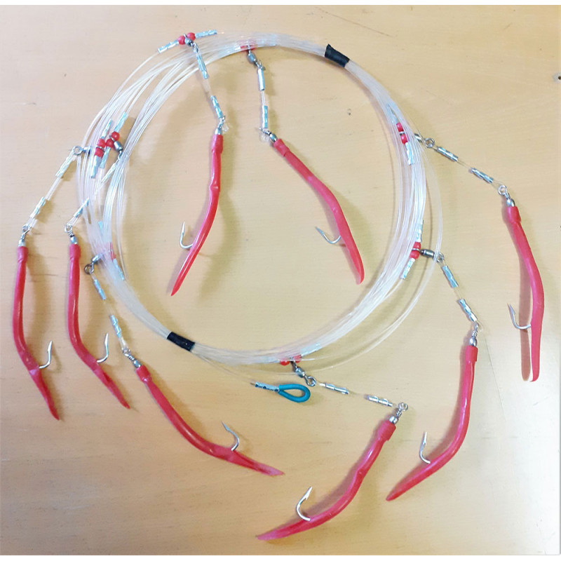 Ferdig montert snik for juksa med valgfri antall, avstand, farge og størrelse. Gummimakken er montert med snuere og et kort forsyn som bringer makken utenfor lina. Kan også monteres med akkar eller svømme-fisk. Send oss spesifikasjonen du vil ha og vi sender et tilbud